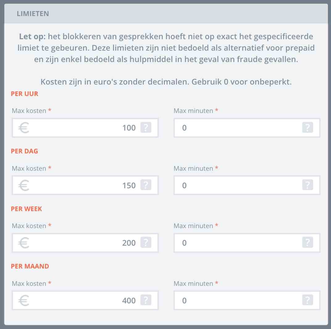 Je kunt per periode een maximum instellen op basis van kosten of minuten: