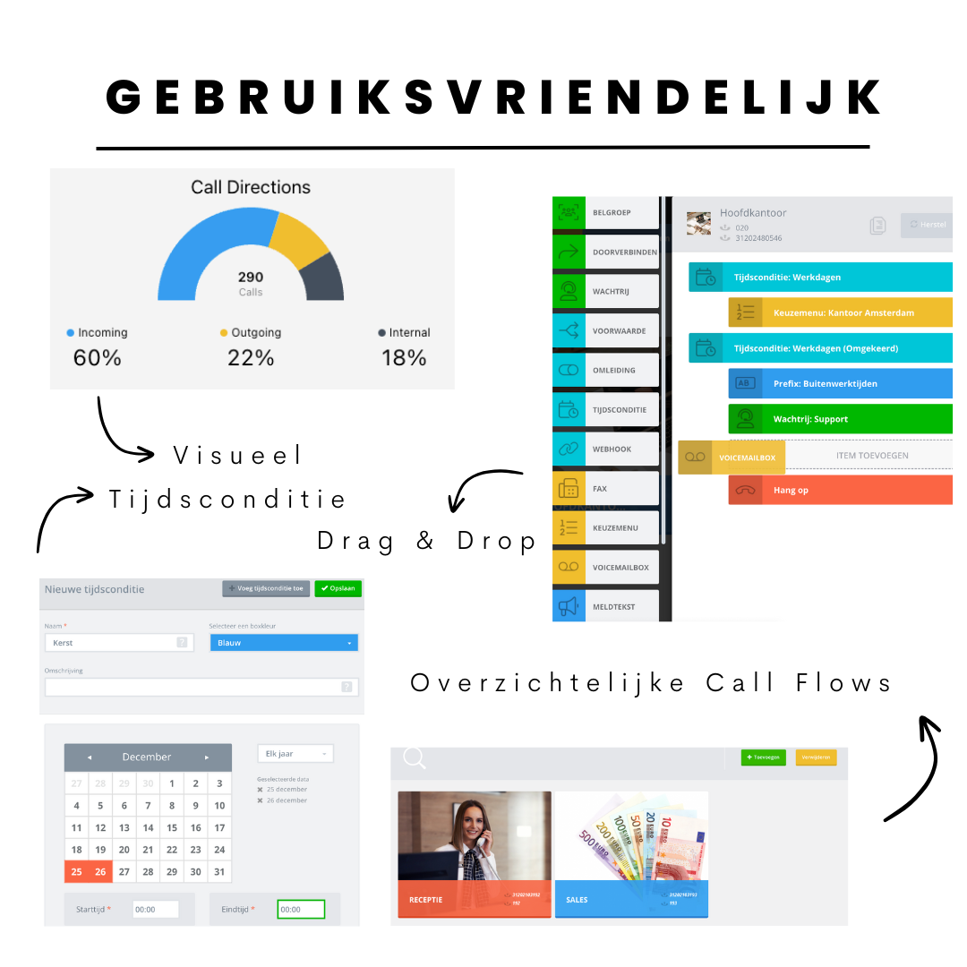 Wachtrijen, keuzemenu’s, voicemail naar e-mail en doorschakelingen stel je zelf in, zonder hulp van IT-specialisten.