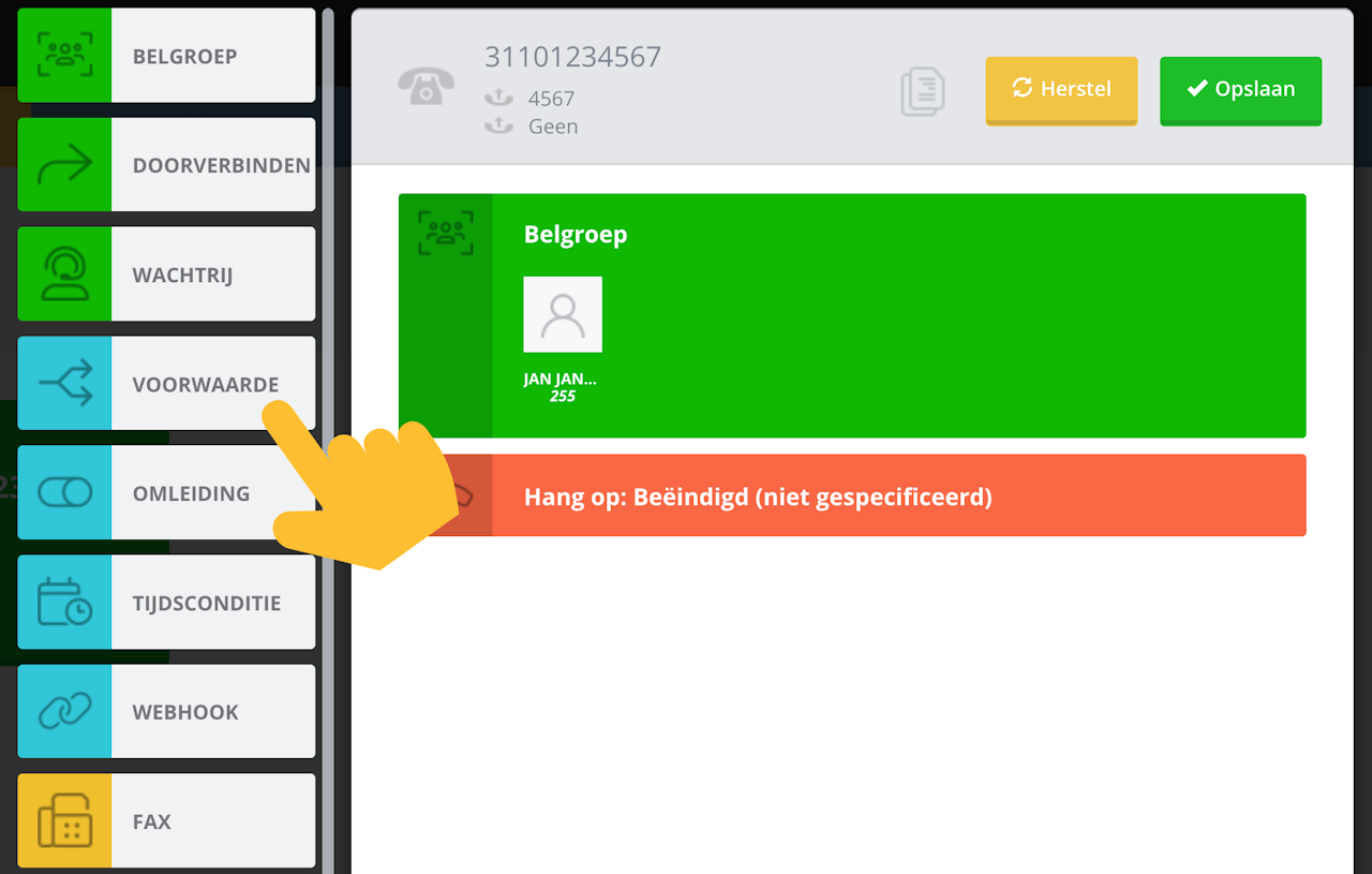 Bijvoorbeeld: als je geen oproepen wilt ontvangen van bepaalde bellers, maak je eenvoudig een voorwaarde aan die overeenkomt met die nummers en koppel je deze aan een Hang Op-actie.